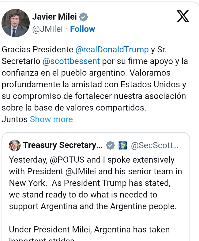 Javier Milei agradeció a Estados Unidos el anuncio sobre la línea de swap por u$s20.000 millones.