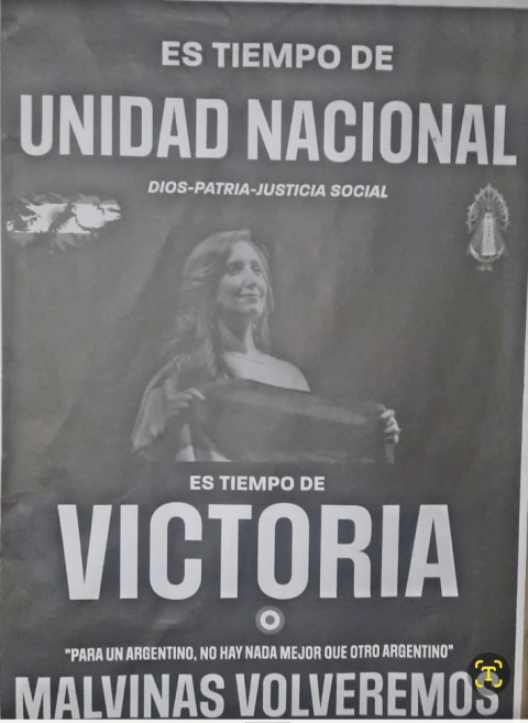 Los afiches aparecieron en diferentes distritos con una consigna sobre Malvinas y VICTORIA, aludiendo a su nombre pero también con el mensaje de TRIUNFO.