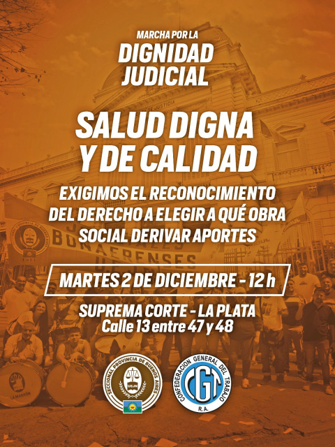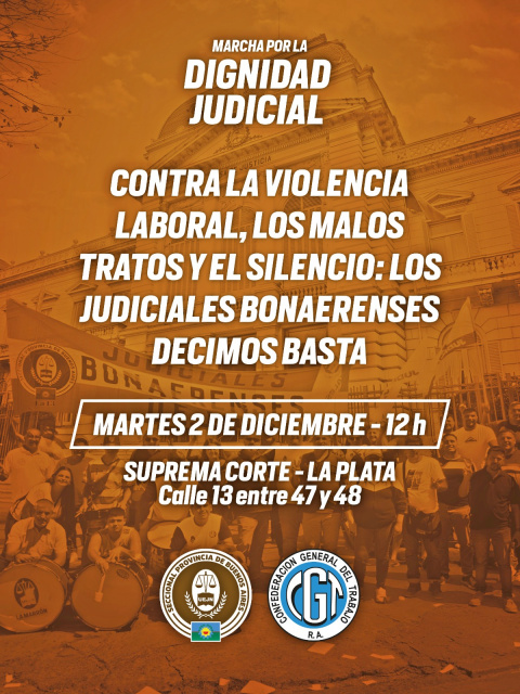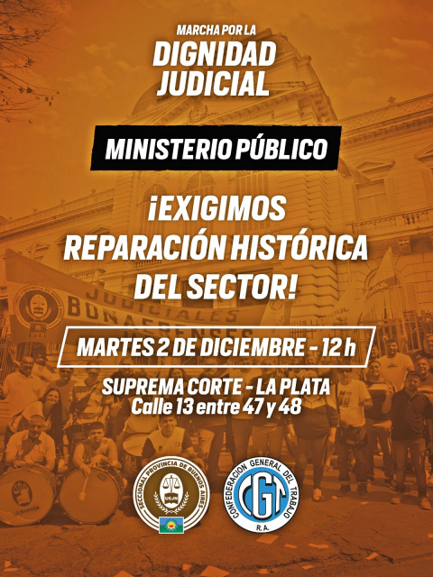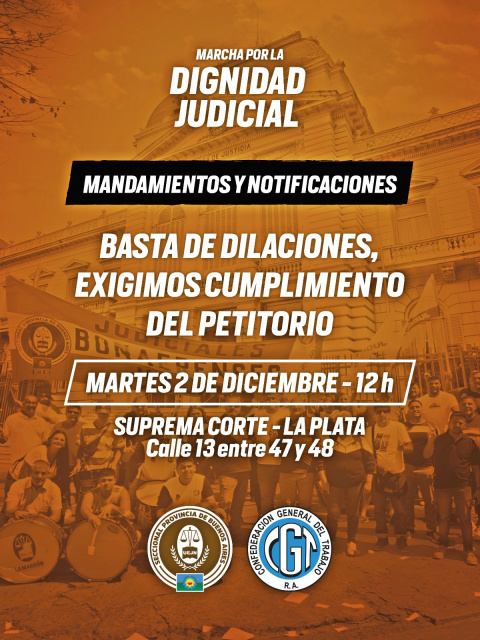 Por todo esto, convocamos a todas y todos los judiciales a participar el próximo martes 2 de diciembre a las 12 horas, de la MARCHA POR LA DIGNIDAD JUDICIAL, frente a la Suprema Corte de Justicia de la Provincia de Buenos Aires sita en la Ciudad de La Plata.