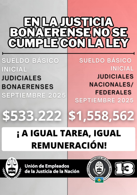 Nuestra organización, la Unión de Empleados de la Justicia de la Nación, lucha en todo el país para ponerle un freno al deterioro salarial y para que se respeten los derechos de quienes hacemos posible la Justicia. Esa misma fuerza y convicción es la que sostenemos desde la Provincia de Buenos Aires, donde el Ejecutivo provincial sigue sin brindar soluciones reales y el Proyecto de Presupuesto 2026 demuestra, una vez más, que la Justicia no es prioridad.