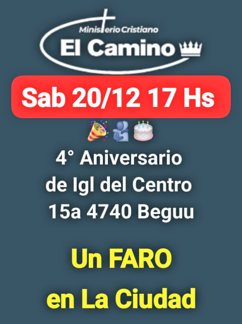 La Iglesia «Del Centro’ del «Ministerio Cristiano El Camino» del Pastor Esteban Kupec invita a la comunidad conversa e inconversa a festejar la Obra del Señor Jesucristo que comenzó en diciembre de 2021.