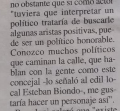 La Nota fue inmortalizada en el Diario El Sol cuando Brandoni dijo que «hay políticos que actúan y mienten pero hay otros que no actúan y dicen la verdad y caminan las calles como este concejal que tengo al lado «, y señaló a Biondo.«Me gustaría hacer una obra de un personaje que caracterice a un político honesto que camina la calle» dijo Brandoni «como este Concejal que tengo al lado» (por Esteban Biondo).